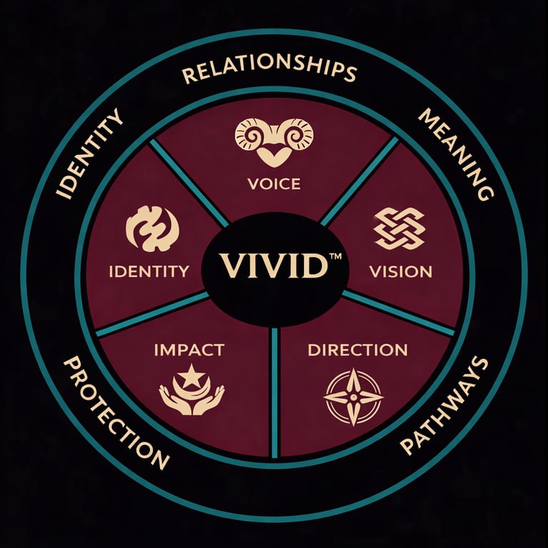 VIVID™ is the diagnostic framework that guides WOVƎN’s executive advisory. It examines five leadership anchors—voice, identity, vision, impact, and direction—within the conditions that shape whether leaders can thrive.
